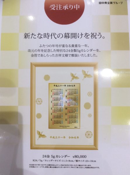 令和元年 純金カレンダー 2019/4/14 田中貴金属ジュエリーでは、 新元号「令和」純金カレンダーが発売になりました。 ご注文は、ラフィーネ平田で承っております。 お気軽にお問い合わせ下さい。 Blog 一覧に戻る