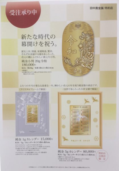 新元号 純金小判・純金カレンダー 2019/4/26 ≪百貨店・特約店限定≫ ○純金小判 令和 20g ¥180,000(税込) ○純金 1gカレンダー 平成三十一年・令和元年 ¥ 15,000(税込) ご注文を承っております。 Blog 一覧に戻る
